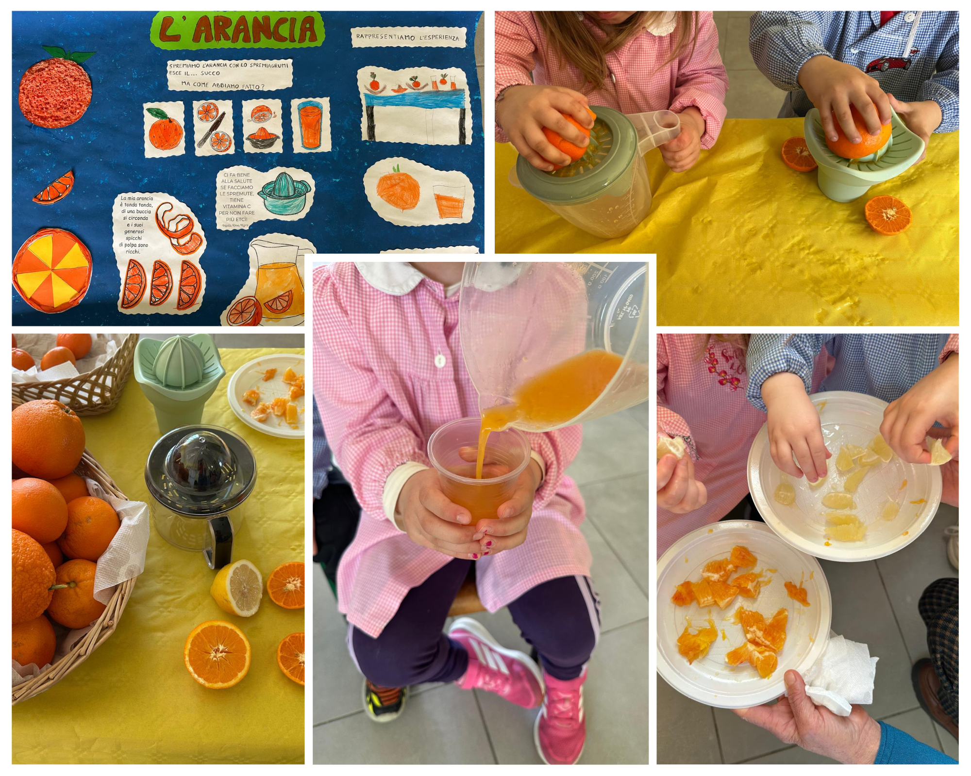 I bambini della scuola dell’infanzia hanno vissuto una dolce esperienza sensoriale dedicata all’arancia. Osservando il colore vivace, toccando la buccia, annusando il suo profumo e assaggiandone la polpa e il succo, i piccoli hanno esplorato questo frutto con curiosità ed entusiasmo. Un momento semplice ma ricco di stimoli, che ha coinvolto i bambini in un percorso di apprendimento attraverso i sensi e la meraviglia della scoperta.