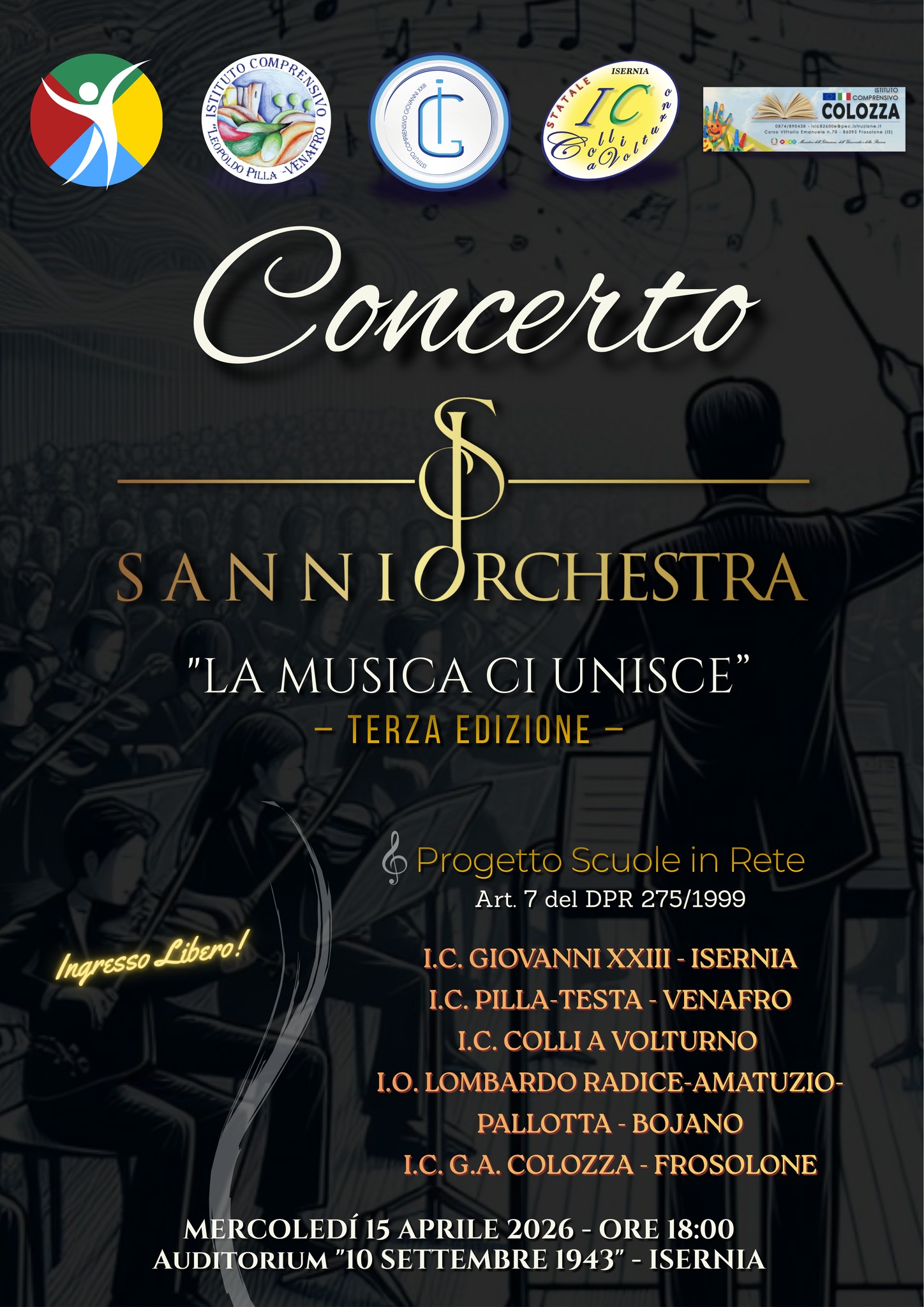 Concerto SanniOrchestra - mercoledì 15 aprirle 2026 ore 18:00 - Auditorium "10 Settembre 1943" Isernia Progetto Scuole in rete - Art. 7 del DPR 175/1999