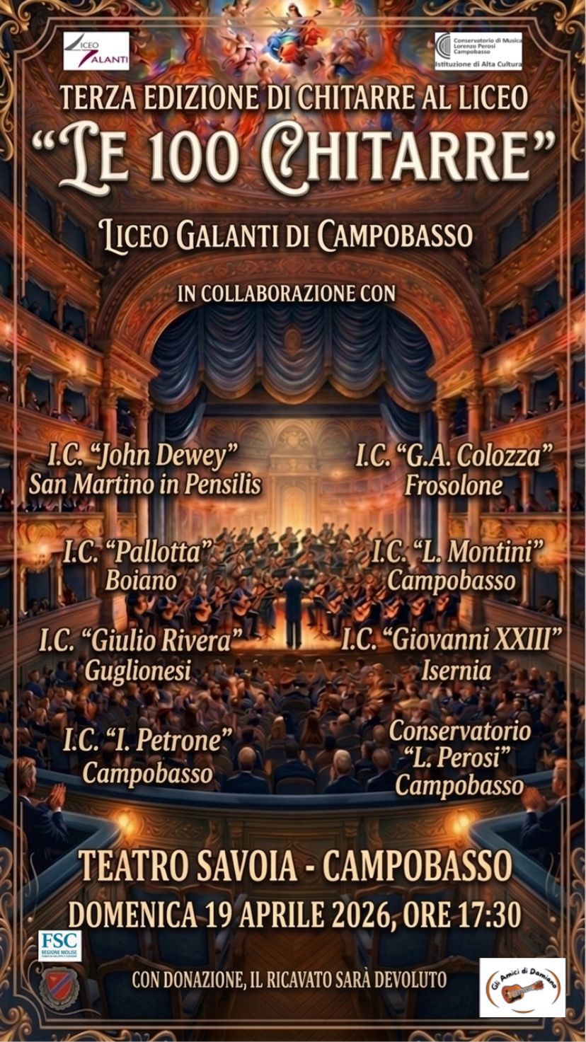 Domenica 19 aprile alle ore 17:30, i nostri alunni della classe di chitarra saranno protagonisti di un evento straordinario! Un grande ensemble che vedrà i nostri ragazzi suonare insieme agli studenti delle altre scuole del territorio, del Liceo Musicale e del Conservatorio "L. Perosi" di Campobasso. Un’occasione unica di musica e condivisione in una cornice prestigiosa. 🏛️✨ Vi aspettiamo per sostenere i nostri giovani talenti! 👏🌟